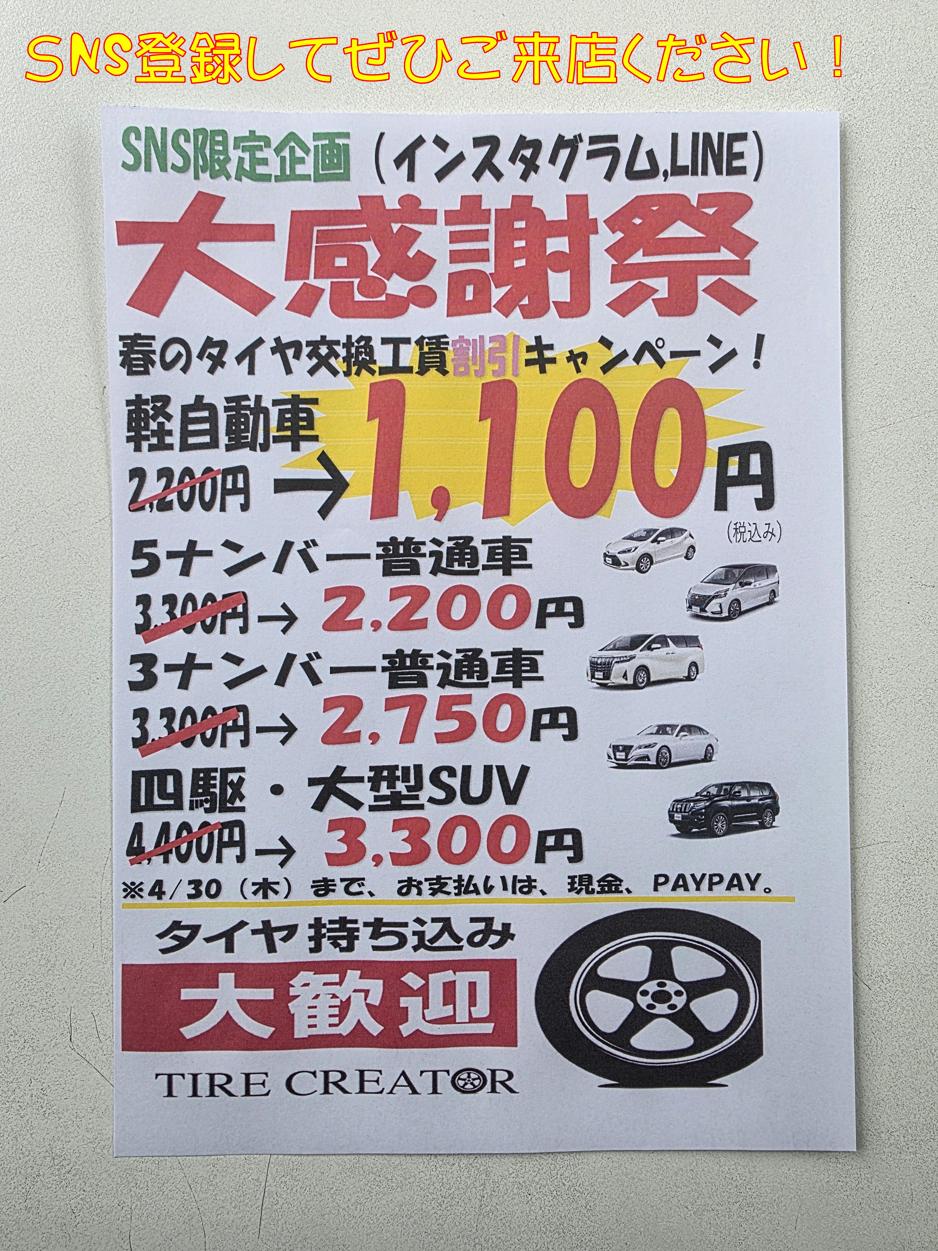 SNS登録限定!タイヤ交換大幅値引き!
